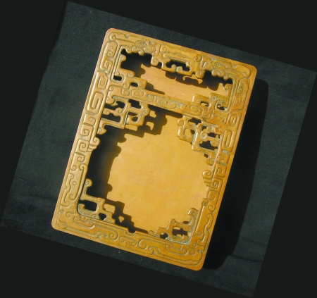 雜項(xiàng)中另有一件器物堪稱珍貴。這是一件清代松花石硯匣,也是文房用品。該硯匣長(zhǎng)15.8厘米,寬11.8厘米,高3厘米,用松花石和透雕工藝全手工精心琢制而成。石質(zhì)細(xì)潤(rùn),石色黃若蒸栗,包漿潤(rùn)亮。匣正面四周浮雕勾連云紋,中間分上小下大兩層,均透雕屈曲盤繞的夔龍紋。匣外底面自右向左豎行分兩行半陰刻行楷省字詩(shī):“綠水橋平東風(fēng)里朱門映柳低按小秦箏多情”,共計(jì)18字,文字豐腴穩(wěn)重,俊美流暢,并有落款:“道光七年,完夫書”,下刻“完”字方印。清道光七年為1827年,張保龍老師認(rèn)為,這首18字省字詩(shī)應(yīng)解讀為一首七言絕句:“綠水橋平東風(fēng)里,風(fēng)里朱門映柳低。映柳低按小秦箏,低按小秦箏多情。”詩(shī)中描繪的似乎是一幅“少女懷春圖”:春風(fēng)吹拂,長(zhǎng)橋臥波,綠水蕩漾,柳絲飄拂,朱門深院之中,一位千金小姐正低首彈箏,似乎在向心上人傾訴自己的懷春之情。真可謂詩(shī)中有畫,景中含情,饒多情趣,耐人尋味。張老師認(rèn)為,“完夫”應(yīng)為清代晚期一位精于鐫刻的書家或詩(shī)人。