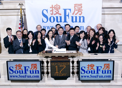 北京時(shí)間9月17日21:30分(美國(guó)紐約東部時(shí)間9月17日9:30分)中國(guó)排名第一的房地產(chǎn)家居網(wǎng)絡(luò)平臺(tái)搜房網(wǎng)(紐交所代碼:SFUN)正式在紐約證券交易所掛牌上市,共發(fā)行2,933,238股美國(guó)存托股票(ADS),每股定價(jià)42.50美元,開(kāi)盤(pán)價(jià)67.00美元,比定價(jià)上漲57.60%。