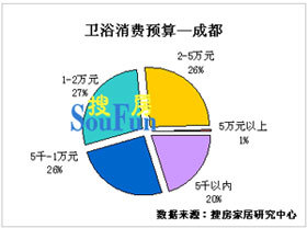 調(diào)查顯示,成都地區(qū)消費(fèi)者在衛(wèi)浴裝修預(yù)算方面的分布比較均勻,除5萬元以上預(yù)算消費(fèi)者僅占1%,其他預(yù)算區(qū)間比例均在20%以上,呈四分天下格局。其中,1-2萬元預(yù)算消費(fèi)者占比稍高,為27%,5千以內(nèi)消費(fèi)者最少,占20%,預(yù)算在5千-1萬及2-5萬元的消費(fèi)者均占26%,并且,與其他主要城市相比,成都地區(qū)高預(yù)算消費(fèi)者明顯位居高位,高于其他城市10-20個百分點(diǎn)。