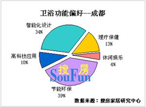 消費(fèi)者對衛(wèi)浴產(chǎn)品的需求不再是簡單的清潔功能,節(jié)能環(huán)保、智能、保健等功能越來越受重視。數(shù)據(jù)顯示,成都地區(qū)消費(fèi)者對節(jié)能環(huán)保功能的偏好程度最大,占比39%,節(jié)水意識已經(jīng)越來越多的被納入衛(wèi)浴產(chǎn)品的基本功能中;34%的消費(fèi)者選擇智能化設(shè)計,在產(chǎn)品中附加智能化功能成為一種趨勢;與其他城市相比,理療保健功能在成都消費(fèi)者中的占比較低,僅為13%,說明偏好理療保健功能的中老年消費(fèi)群體更多的選擇了節(jié)能環(huán)保功能。