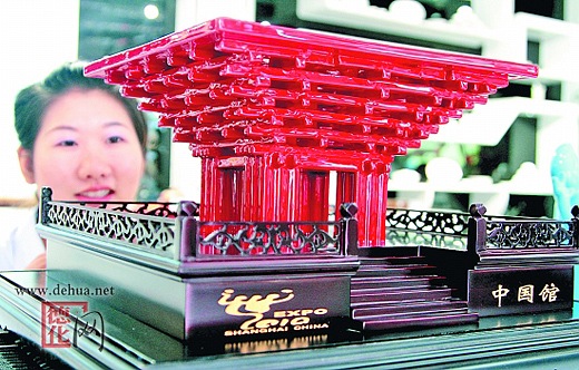 前日,在德化某陶瓷店的展廳內(nèi),兩件新亮相的陶瓷模型作品吸引了眾人的目光,它們就是即將于國(guó)慶期間,在上海世博會(huì)場(chǎng)館展覽的紅色中國(guó)館陶瓷作品和藍(lán)色海寶陶瓷作品。
