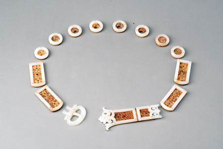 大唐西市博物館展有一組精美絕倫的唐代金框?qū)氣毎子駧с。帶?jì)十四事,八刓,四銙;另鉈尾、帶扣各一。玉質(zhì)晶瑩剔透、細(xì)膩溫潤(rùn)。掐絲工藝做框,其間鑲嵌各色寶石,金玉珠寶相映生輝。