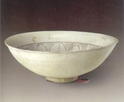 碗撇口、淺腹、圈足。外壁光素?zé)o紋,碗內(nèi)于釉上劃刻花紋,刀法深刻有力,線條粗獷灑脫,表現(xiàn)了北方民間瓷窯質(zhì)樸平實(shí)的裝飾風(fēng)格。此種形制紋樣的碗,在河北省峰峰礦區(qū)內(nèi)的觀臺(tái)鎮(zhèn)窯址、彭城鎮(zhèn)窯址,都曾出土有大量的瓷器碎片的標(biāo)本,是宋末金初北方廣大地區(qū)尋常百姓之家使用的日常器皿。