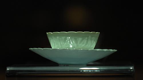 圖為展出的一件隨“南海一號(hào)”打撈出水、由國(guó)家博物館館藏的宋青白釉葉脈紋芒口碗及葉脈紋淺腹盤(10月2日攝)。
