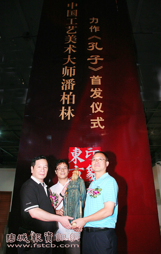 此陶藝作品《萬世師表——孔子》是根據(jù)周潤發(fā)主演的電影巨獻《孔子》原型啟發(fā)而創(chuàng)作的,潘柏林大師在創(chuàng)作中既采用石灣陶塑傳統(tǒng)的技法,如線條刻畫,衣紋構(gòu)造,肌理表現(xiàn),十分工巧仔細,體現(xiàn)大師深厚功力;又吸收現(xiàn)代雕塑的簡練手法,造型洗練流暢;著釉上更是大膽創(chuàng)新,采用透明玻璃質(zhì)效果的青綠釉著色在整套衣服上,釉色古拙亮澤,又流動成畫狀圖案,而且件件變幻,各自晶彩。為了最好地創(chuàng)作出滿意之作,潘柏林大師認真研讀關于的著名和畫作,三度觀看《孔子》影片,還查閱春秋時代的頭飾、冠冕、服裝、衣帶、鞋的特色,佩劍、發(fā)簪、玉佩的圖案、紋理、材質(zhì),都研究透徹,一絲不茍。在釉色上,不惜用了六件作品試釉,直至最后定色,反復比較,高度重視作品效果,確是前所未有!度f世師表——孔子》為限量收藏品,在當日首發(fā)式上其中一件由東方印象藝術(shù)館和潘柏林大師捐贈給佛山祖廟內(nèi)的佛山孔廟珍藏。佛山祖廟相關負責人對這種弘揚文化事業(yè)之余不忘社會公益的善舉大加贊揚。(記者 潘炳森)