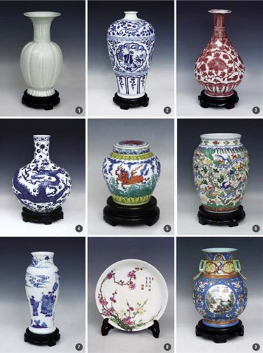 “御窯千秋”九件皇家珍瓷包括:《北宋影青瓜棱瓶》、《元青花四愛圖梅瓶》、《明洪武釉里紅纏枝牡丹紋玉壺春瓶》、《明永樂青花龍?zhí)撇菁y天球瓶》、《明成化斗彩海水天馬紋天字罐》、《明萬歷五彩百鹿罐》、《清康熙青花指日高升圖觀音瓶》、《清雍正琺瑯彩題詩過墻梅竹紋盤》、《清乾隆粉彩藍(lán)地開光山水轉(zhuǎn)心瓶》。整套作品是珍貴的傳承,更是不可多得的藝術(shù)財(cái)富。(詳情可咨詢400-650-9506)