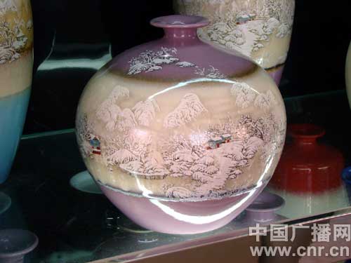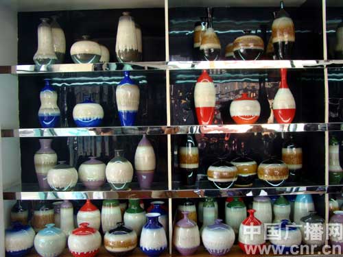 四年過去了,2010年,記者第三次參加景德鎮(zhèn)國際陶瓷博覽會(huì),在閑暇之余再次來到了這家小店,店內(nèi)展示的產(chǎn)品已霍然一新,不僅出現(xiàn)了不少新的造型別致的觀賞瓶,而且器形、釉色看起來特別鮮艷和亮麗,經(jīng)詢問才得知,原來這是在以前結(jié)晶釉類型產(chǎn)品的基礎(chǔ)上推出的寶石釉與窯變相結(jié)合的裝飾類陶瓷新品。