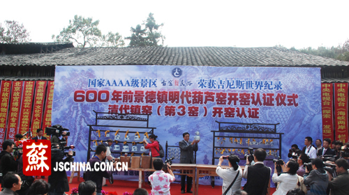 景德鎮(zhèn)古窯民俗博覽區(qū),10月22日上午,這里出現(xiàn)了彩旗招展、鑼鼓喧天、嘉賓滿座、記者云集的盛況。景德鎮(zhèn)第七屆國(guó)際陶瓷博覽會(huì)期間最令人矚目的活動(dòng)——景德鎮(zhèn)明代葫蘆窯暨清代鎮(zhèn)窯(第3窯)復(fù)燒開(kāi)窯認(rèn)證儀式在這里隆重舉行。