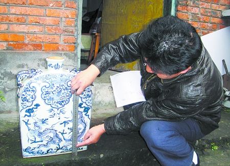 昨日,眉山市民李明明(化名)稱,在清理老屋時,他發(fā)現(xiàn)老屋的床下放著一個腐朽的木箱,打開一看,里面全是厚厚的稻草,一個陶瓷扁壺靜靜地躺在里面。扁壺上,兩面圖案相同,壺下半部分繪二龍戲珠,上半部分兩只鳳凰傲然飛翔,兩邊各繪有一朵靈芝,輔以水、云紋等。在壺的兩側(cè),各有三朵牡丹,壺頸處畫有兩朵牡丹,壺肩四只螭朝上匍匐著。