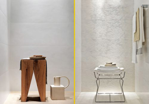 左圖Marazzi推出的ConCreta將粘土和礦物水泥的純凈特性發(fā)揮到了極致,用現(xiàn)代的方式表現(xiàn)了作品色彩和材質(zhì)上的主題對比。右圖的Stonevision則表現(xiàn)了大理石那種經(jīng)典的優(yōu)雅氣質(zhì)。