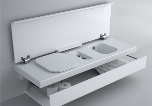 Hatria的G Full水池是一個創(chuàng)新的衛(wèi)浴解決方案,它將許多不同的功能都整合于一身,除了傳統(tǒng)的洗手池和深的洗衣盆外,它還包括了置物擱板、儲物柜,上面的擋板放下來,它甚至就變成了一條長凳。