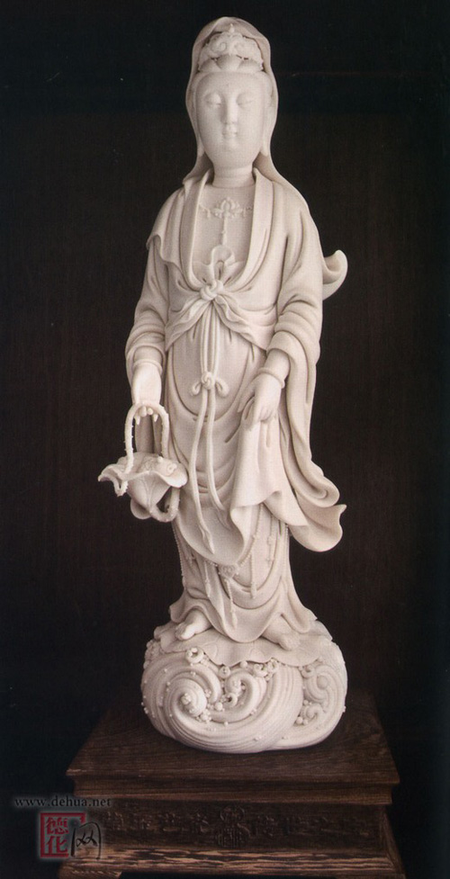德化瓷素以“自如玉、明如鏡、薄如紙、聲如如磐”聞名,追其根由,自然離不開當(dāng)?shù)靥厥獾拇赏。與同為瓷都的江西景德鎮(zhèn)、湖南醴陵相比,德化出產(chǎn)的瓷土更具延展性,也更純凈,其氧化硅、氧化鉀含量比較高,所以燒成后玻璃質(zhì)較多,看上去瓷胎致密,透光優(yōu)良,如霜似雪。歷代德化瓷塑大師都以這得天獨厚的白為榮,堅持用“白”的原色來做瓷塑,因為在這么溫潤、清雅的白上施任何色彩都顯得多余。這點,蘇清河大師也很認(rèn)同。在他看來,好的瓷土做出的素瓷本身就很美,就可以雕塑出一等完美的作品,自然地展現(xiàn)德化白瓷的質(zhì)樸美。這樣的瓷質(zhì)不僅不需要彩繪裝飾,有時甚至連釉都可以忽略。因為上釉的厚薄一旦控制不好,所塑造的人物細(xì)部就可能發(fā)生變形,在光影上也會顯得不夠真實。不過上釉的塑像也可呈現(xiàn)另外一種美麗——窯變產(chǎn)生的釉色。在窯爐中,燒造的氣氛和位置的不同會使瓷的釉色發(fā)生變化,有時會燒出“象牙白”、“豬油白”、“孩兒紅”等截然不同的釉色。這種可遇不可求的“天意”也使得德化瓷塑更具收藏價值。