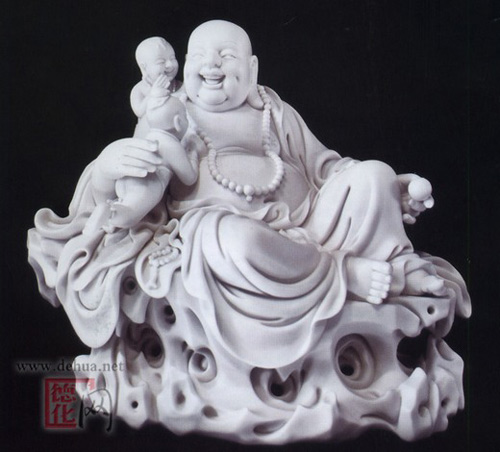 德化瓷塑與以往大眾熟知的官窯瓷器最大的區(qū)別就是生活化。由始至終,德化一直主打民用瓷和外銷瓷。所以每個時代,依據(jù)審美觀念和需求的不同,德化瓷塑都有各自的藝術(shù)風(fēng)格。比如明代,在當(dāng)時的自然經(jīng)濟壓力下,何朝宗、張壽山、林朝景、陳偉、林希宗、林孝宗等瓷塑藝術(shù)大師既有為寺廟制作氏相莊嚴肅穆的佛像,也有為平民百姓燒造親切的觀音、彌勒,喜慶的關(guān)公、和合二仙等,真正實踐了藝術(shù)的雅俗共賞、亦莊亦諧。到了文革時期,在紅色思潮的影響下,德化瓷塑專注燒造出了當(dāng)時非常流行的毛澤東像、胸章以及紅燈記等多種紅色經(jīng)典,成為難得的時代紀念。改革開放之后,人們的思想不再禁錮,無論是追尋過去某個階段的時代特色還是追尋現(xiàn)代審美觀的創(chuàng)作都層出不窮。不過無論哪個時期,傳統(tǒng)德化瓷塑,自明代何朝宗以來,就以“整體寫意以形寫神”精神為主導(dǎo),并不強調(diào)精確的人體比例。例如“瓷圣”何朝宗就喜歡通過衣紋特征來烘托人物的精神氣質(zhì)。他雕刻的衣紋圓柔自若,婉轉(zhuǎn)流暢,又不拘一法,靈活自然,不僅能將衣服質(zhì)地的輕薄、厚重之感真切地刻畫出來,還能通過衣紋的走向、折變來表現(xiàn)人體的動態(tài)、身段,并以此來烘托人物的精神氣質(zhì)和內(nèi)在性格。另外,尤其重要的一點是,自何朝宗以來的瓷塑大師們,無論采用了哪種表現(xiàn)形式,都將自己的情感貫穿于創(chuàng)作過程始終。人物的內(nèi)心世界,也永遠是他們最想要表達的:比如觀音優(yōu)美的身姿、細潤豐滿的肌膚,以及微微鼓起的口唇與柔和下垂的眼臉,都是為了要表現(xiàn)出一個栩栩如生的柔美形象,以使整個瓷塑具有一種極為吸引人的特殊魅力。幾十年來蘇清河大師都在研究佛教經(jīng)典,在創(chuàng)作傳統(tǒng)的佛像時不畫草稿,不給自己設(shè)限,完全憑借此時自己對佛意的理解去雕塑:觀音常以蓮花為座,為何不能以荷葉為座?既然觀音的幻化無邊,為何要一直拘泥于蓮花之上?手里的竹籃改成荷葉幻化的籃子不是更有仙氣?這些源源不斷的奇思妙想使蘇清河大師的傳承不僅僅止步于模仿,更融入了個人全新的理解,成就了真正的大家之風(fēng)。