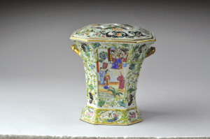 廣彩開窗人物紋八方形雙耳花插。嘉慶至道光年間