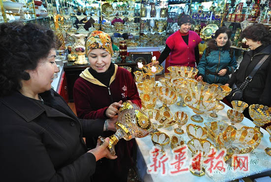 11月11日,陶瓷經(jīng)營戶古麗扎爾(左二)在向顧客介紹自己的產(chǎn)品。古麗扎爾今年8月在烏魯木齊市成立了我區(qū)首家民族陶瓷工藝加工廠。目前,該廠生產(chǎn)的具有民族特色的陶瓷品種已達(dá)40余種,產(chǎn)品遠(yuǎn)銷全疆各地及中亞市場。