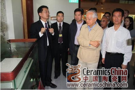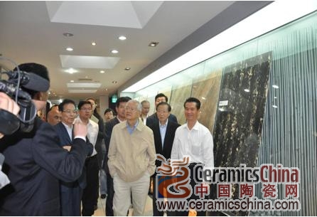 調(diào)研組一行首先來到輕質新型建材館,張旗康董事詳細為調(diào)研組介紹了目前國內(nèi)唯一、代表世界最先進水平的新型建材--建筑陶瓷薄板(PP版)和無機輕質板材(QQ板)。當了解到浮在魚缸中的無機輕質板(QQ板)50%以上的原料為陶瓷工業(yè)廢渣,具備防火、隔音等多種功能以后,調(diào)研組人員都驚嘆當今民營企業(yè)的創(chuàng)新之舉。此外,工作人員還現(xiàn)場演示了3.5mm的PP板,其韌性和硬度令在場人員折服,而各種不同風格和堪比天然石材的表面裝飾效果更令調(diào)研組人員大加贊嘆。吳敬璉專家對蒙娜麗莎作為主起草人的《陶瓷板》、《建筑陶瓷薄板應用技術規(guī)程》兩項國家標準頗感興趣,對兩項標準的起草程序等關鍵環(huán)節(jié)提出了疑問,在場的陶瓷行業(yè)專家陳帆教授一一做了解答,并就建筑陶瓷行業(yè)相關標準的制