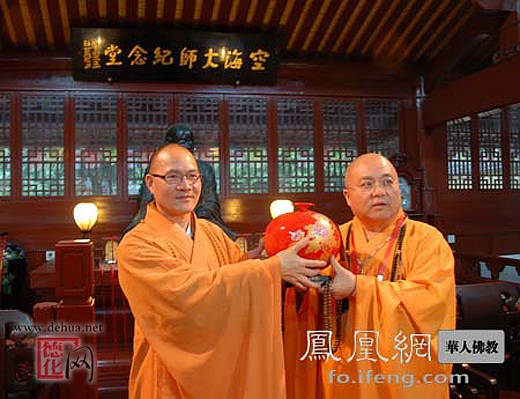 本性法師向果東大和尚贈送瓷瓶(圖片來源:鳳凰網(wǎng)華人佛教 攝影:梁龍騰)