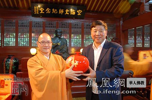 本性法師向葉小文贈送瓷器(圖片來源:鳳凰網(wǎng)華人佛教 攝影:梁龍騰)