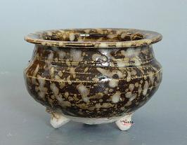 圓唇,沿外折,深筒形腹略鼓,黑地,上以白色釉汁淋灑形成線條及塊狀斑。燒成溫度較高,釉面及塊斑完全;,彈之音色清脆。