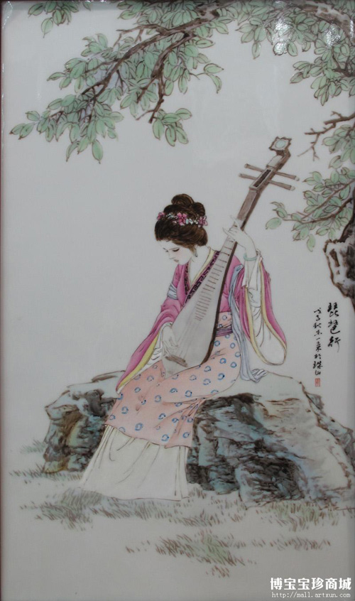 瓷板畫便于表現(xiàn)中國畫的神韻和意味,符合中國人傳統(tǒng)的審美習(xí)慣和審美趣味。這件瓷板畫《琵琶行》也是出自李一來先生之手,收藏于博寶寶珍商城。粉彩的演繹將女子形象渲染的婉約迷人,畫中的女子婉約動人,低首彈著琵琶,樹上枝繁葉茂,畫面十分唯美,我們仿佛隱隱約約能聽見琵琶聲,畫中的每一個細(xì)節(jié)都展現(xiàn)著精湛的工藝,實(shí)屬瓷板畫中的精品。(博寶藝術(shù)評論員 孫瑞峰 撰文)