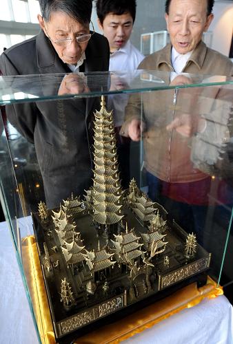 觀眾在展會(huì)上參觀銅雕手工藝品。