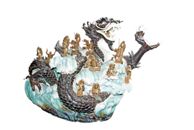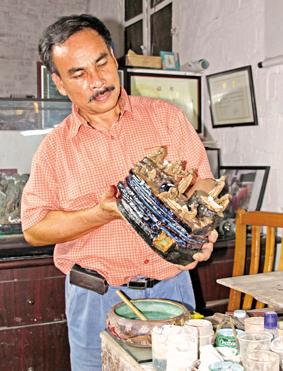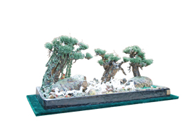 不過,劉國祥也表示,以前的石灣微塑題材較單一。由于都做成單件的“山公”,或是人物或是亭臺樓閣,一般都是放在假石山上作為裝飾,也不怎么追求精細,因此這個行當(dāng)?shù)陌l(fā)展一直比較緩慢。直到他的上一輩才首次以微塑盆景作為表現(xiàn)形式出現(xiàn),方才大大拓展了石灣微塑的題材領(lǐng)域。微塑盆景可以將祖國的大好河山濃縮到一個盆景中進行表現(xiàn),而且做工更加精細。