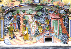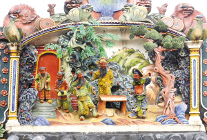 灰塑“桃園三結(jié)義”位于崇敬門(mén)頂部,與端肅門(mén)頂部的“唐明皇游月宮”相呼應(yīng)。內(nèi)容取材于中國(guó)古典名著《三國(guó)演義》第一回“祭天地桃園結(jié)義”。傳東漢末年,天下紛爭(zhēng),王室衰微,各具才華的劉備、關(guān)羽、張飛恰巧相逢,三人意氣投合,于是在河北涿州“桃園三結(jié)義”,誓同生死,救國(guó)扶危,匡復(fù)漢室。