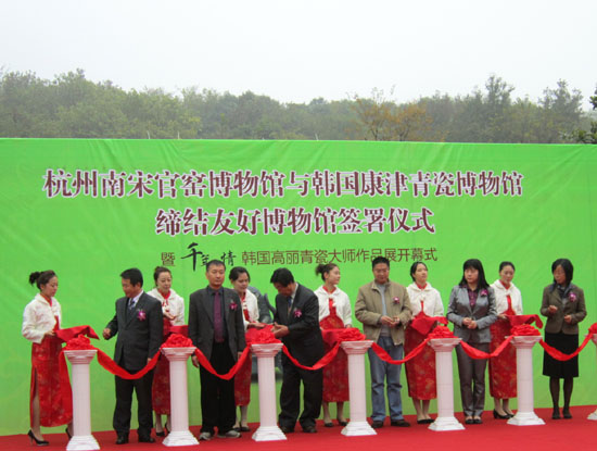 中韓兩國(guó)的文化交流源遠(yuǎn)流長(zhǎng),兩國(guó)間的陶瓷文化交流綿延不絕。杭州南宋官窯博物館是座依托古窯遺址建立的陶瓷專題博物館,著名的郊?jí)鹿俑G遺址就坐落在館區(qū)之中;康津青瓷博物館同樣也是保護(hù)和展示高麗青瓷窯址、弘揚(yáng)高麗青瓷文化藝術(shù)的陶瓷專題館,極其相似的建館背景,同樣致力于恢復(fù)和發(fā)展官窯青瓷藝術(shù)魅力的目標(biāo),使得兩館能夠順利建立起友好關(guān)系,相互學(xué)習(xí),共同進(jìn)步,把青瓷這一人類共有的文化遺產(chǎn)不斷傳承下去。