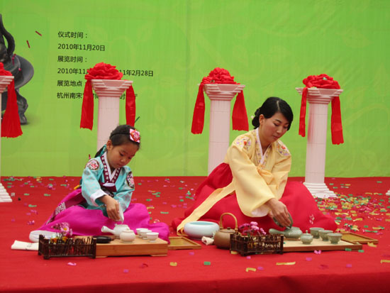 康津文化院金奎植院長(zhǎng)、杭州南宋官窯博物館鄧禾穎館長(zhǎng)先后致辭,表達(dá)了建立友好關(guān)系的目的和重要意義,并在掌聲中簽署了協(xié)議書(shū)。之后韓方嘉賓崔漢善、李龍熙、金圭植,中方嘉賓王宏偉、徐璧和、鄧禾穎共同為“千年之情——韓國(guó)高麗青瓷大師作品展”的開(kāi)展剪彩。最后,來(lái)自韓國(guó)的茶藝師高恩井小姐還為現(xiàn)場(chǎng)朋友帶來(lái)了精彩的韓國(guó)茶道表演。而表演所用的茶具正是李龍熙大師的作品,希望能通過(guò)表演向大家展示融入茶道精神的高麗青瓷的獨(dú)特魅力。