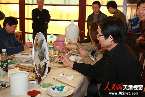 11月26日,來(lái)自景德鎮(zhèn)的九名陶瓷書畫藝術(shù)家匯聚天津,與津城本土?xí)嬎囆g(shù)家和社會(huì)各界一起交流書畫藝術(shù),他們?cè)谔旖蚬臉翘詫氒幦龢钦箯d現(xiàn)場(chǎng)獻(xiàn)藝:表演瓷藝、燒制陶瓷書畫作品,并做現(xiàn)代陶瓷鑒賞專題演講。參展者盡情欣賞了瓷藝表演并參觀了陶瓷書畫展,現(xiàn)場(chǎng)感受到了陶瓷繪畫和燒制的帶來(lái)的藝術(shù)魅力。
