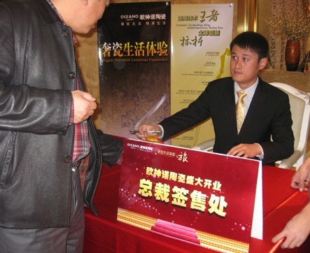 2010年11月20日,“中國古都,天下大同”氣溫返暖,陽光和煦。在這北國寒冬難得好日子,奢瓷生活體驗之旅——歐神諾陶瓷大同鉑金館盛大開業(yè)暨總裁簽售如期舉行。佛山歐神諾股份有限公司華北大區(qū)經(jīng)理刑野先生、歐神諾陶瓷大同總代理柴桂珍女士、大同金牛精品裝飾城市場領(lǐng)導(dǎo)及將近百名社會名流嘉賓出席了大同鉑金館的開業(yè)盛典,大同電視臺等主流媒體競相報道了這一開業(yè)盛況!