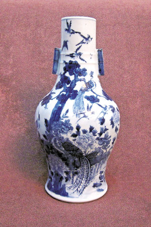 另一件“青花五倫圖弦紋竹節(jié)貫耳瓶”來自麻城。直口、鼓腹、束腰,兩邊一對(duì)竹節(jié)耳,造型別致;瓶身繪鳳凰、仙鶴、鴛鴦、鹡鸰、黃鶯,分別代表中國傳統(tǒng)社會(huì)基本的五種倫常關(guān)系,即君臣、父子、夫妻、兄弟、朋友。朱軍認(rèn)為,這件竹節(jié)貫耳瓶造型比較少見,其表現(xiàn)的主題內(nèi)涵相當(dāng)豐富,也是一件精品。