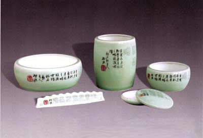 在這里,我們重點(diǎn)介紹一下“雨點(diǎn)釉陶”。“雨點(diǎn)釉陶”產(chǎn)于博山,始于宋代,因漆黑的釉色表面上星布著斑點(diǎn)而得名。如果用雨點(diǎn)釉陶器盛茶水,則斑點(diǎn)便象金星般熠熠發(fā)亮。雨點(diǎn)釉陶當(dāng)時(shí)盛行于世,并流傳東瀛,為日本人所珍愛。其后,全國(guó)興起青花白釉瓷,油滴瓷制作技藝逐漸湮沒失傳,后人雖曾多次努力試驗(yàn),但仍未恢復(fù)。本世紀(jì)20年代,著名博山陶瓷藝人侯相會(huì)經(jīng)多年反復(fù)探索實(shí)驗(yàn),直到1936年才取得成功,博山“雨點(diǎn)瓷”自此揚(yáng)名海內(nèi)外。其技藝特點(diǎn)是:在點(diǎn)亮似漆的底色上,疏密有致地遍布小如粟米大如黃豆的銀白色圓點(diǎn),以茶水入器,器內(nèi)金光熠熠,如注入清水或白酒,則銀星閃耀,映日視之,晶瑩奪目,器形端莊凝重,古抽樸雅,有宋代遺韻,F(xiàn)在侯老藝人已謝世,幸喜絕技后繼有人,博山美術(shù)陶瓷廠生產(chǎn)的雨點(diǎn)釉陶器有雙龍瓶、天球瓶、柳葉瓶,以及盤、盞、茶具、文具、酒具等種,風(fēng)格獨(dú)特,深受國(guó)內(nèi)外人士喜愛。