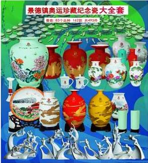 景德鎮(zhèn)“奧運(yùn)瓷”是在北京奧運(yùn)會(huì)期間,經(jīng)第二十九屆奧組委授權(quán),享有世界瓷都美譽(yù)的景德鎮(zhèn)傾力打造的一套集奧運(yùn)精神和傳統(tǒng)工藝以及當(dāng)代人文精神于一體的奧運(yùn)紀(jì)念珍藏瓷,包括“奧運(yùn)紀(jì)念瓷”、“奧運(yùn)飾品瓷”、“奧運(yùn)日用瓷”、“奧運(yùn)陳設(shè)藝術(shù)瓷”、“奧運(yùn)珍藏紀(jì)念瓷”等5大類83個(gè)品種162款?yuàn)W運(yùn)特許商品。這套產(chǎn)品不僅是景德鎮(zhèn)瓷器工藝集大成者,也是首次發(fā)行的奧運(yùn)瓷,并且限量發(fā)行,不可再生。奧體瓷業(yè)公司總經(jīng)理王耀說,“產(chǎn)品制作后,我們從模具等各方面,全部毀掉,以后再不可能做出來了,因此具有巨大收藏價(jià)值。”