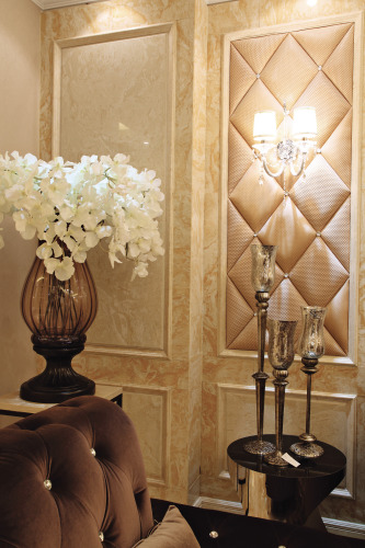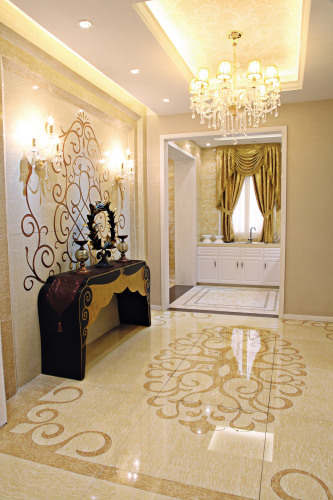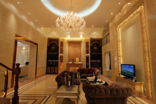 裝修上我們用的是也是高標準,用磚上我們用到了很多深加工的工藝,像大廳地面大型的拼花;墻面上的倒角、雕刻裝飾;門套上的立體鋪貼;鎦空的背景墻等都是很精致的。另外我們也用到了很多瓷磚和其它材質配合的嘗試,比如茶鏡、金屬、木線、壁紙、皮毛的搭配裝飾,在細節(jié)上做得既金碧輝煌的華麗而不會空洞俗氣。你可以看到我們用的家具、燈飾也是配合得很好的,整體就是一個現代歐式的別墅。