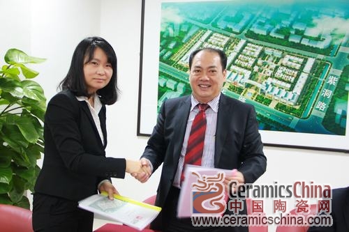 中國陶瓷城、總部基地營運總經理余敏(左)與恒達陶瓷董事長黃家洞(右)簽定進駐合同,攜手合作