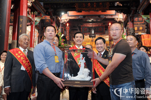 近期,在泉州霞洲媽祖宮赴臺(tái)灣臺(tái)南大天后宮秋季祭奠之時(shí),霞洲媽祖宮將德化瓷藝大師蘇志強(qiáng)之精心創(chuàng)作的瓷塑作品《大地飛歌》作為禮品贈(zèng)送與臺(tái)灣領(lǐng)導(dǎo)人、中國(guó)國(guó)民黨主席馬英九。