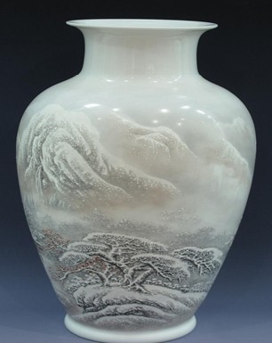 《風(fēng)雪夜歸人》,江西省工藝美術(shù)大師、高級(jí)工藝美術(shù)師袁世文的代表作品。1947年,袁先生生于「陶瓷世家」,其舅公汪野亭系享譽(yù)海內(nèi)外的景德鎮(zhèn)「珠山八友」之一。他從小受家庭藝術(shù)熏陶,13歲就隨父親袁林學(xué)畫山水,曾師從著名陶瓷美術(shù)家王云泉,后又受教于其父好友,素有「雪景大王」之稱的陶瓷美術(shù)家余文襄,并受其姑母輕工陶研所著名陶瓷美術(shù)家汪桂英于理論上的指導(dǎo),在雪景山水方面很有成就,擅長(zhǎng)工藝粉彩雪景山水畫。通過這款《風(fēng)雪夜歸人》我們可以品味到其中的獨(dú)到韻味,意境清緲,層次感強(qiáng),前與后的巧妙交融使一種獨(dú)屬于山水畫的幽深之感在瓷器作品中淋漓盡致的展現(xiàn),松姿飽滿,雪色潤(rùn)澤,我們彷佛從中嗅到清新的大自然氣息,內(nèi)斂沉穩(wěn),風(fēng)姿卓越,是難得的當(dāng)代名家瓷精品
