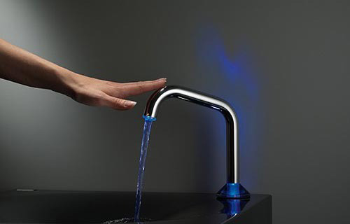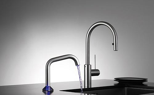它的控制方法非常簡(jiǎn)單,點(diǎn)擊一次,出冷水(藍(lán)色),兩次暖水(橙),三次熱水(紅)。內(nèi)置的LED燈讓水流呈現(xiàn)不同的顏色,提示你水的溫度。10秒后,水會(huì)自動(dòng)關(guān)閉。這款水龍頭還具有清潔模式,可以自動(dòng)進(jìn)行清潔,只要通過(guò)較長(zhǎng)的觸摸激活它即可。