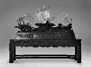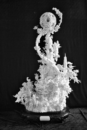 玉雕作品《日月同輝》售價2億元,是3件一套的作品,原料出自一塊62cm×62cm×9cm的黃龍玉原石上,為當今黃龍玉石雕刻一絕。牙雕作品《盛世乾坤》從設(shè)計制作到完成,耗時20年。其主體巨龍噴出水柱襯托起龍珠(57層象牙球),最為珍貴的57層象牙球直徑17厘米,每層薄如絲紙,且均為鏤空雕刻,層層可轉(zhuǎn)動。制作象牙球的材料是一支珍藏上百年的非洲象牙,重80公斤。