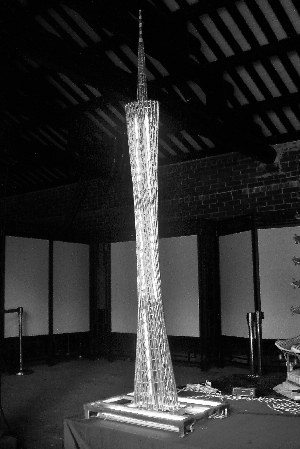 利用廢舊鐵線(絲)、鐵皮,經(jīng)扭曲、裁割、粘合成的《廣州塔》,高2.1米,則表達了民間藝人對廣州亞運會的關(guān)注和熱愛。