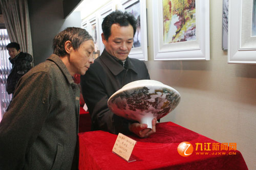 為加強(qiáng)兩地文化交流,12月9日,由中國(guó)工藝美術(shù)大師賴德全等領(lǐng)銜的景德鎮(zhèn)市陶瓷研究所工藝美術(shù)大師陶瓷作品展在九江民俗博物館隆重開幕。陶瓷名家現(xiàn)場(chǎng)表演釉上彩和“潑墨”技藝,一幅幅山泉淙淙、峰巒疊嶂的精美畫卷在觀眾嘖嘖稱奇中躍然于陶瓷上。