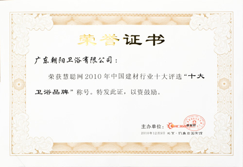 朝陽衛(wèi)浴最近可謂捷報(bào)連連,自11月28日朝陽衛(wèi)浴公司董事長葉國榮先生榮獲2010年度中國建筑衛(wèi)生陶瓷協(xié)會(huì)優(yōu)秀企業(yè)家后,朝陽衛(wèi)浴再度榮獲“中國新勢力---2010年建材行業(yè)十大衛(wèi)浴品牌”。
