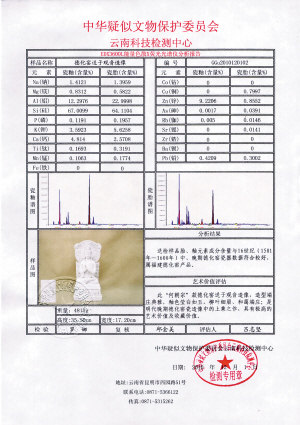 中心主任呂志堅(jiān)介紹,何朝宗是德化窯瓷塑的代表人物,他主要活動于明朝嘉靖、萬歷年間。因?yàn)閺那宕鹁陀腥朔轮破渥髌,所以為提供科學(xué)、客觀的鑒定結(jié)果,中心遵循目鑒加科技檢測的鑒定方法。檢測人員在EDX—3600L儀器真空條件下對觀音造像胎、釉取樣點(diǎn)作雙重檢測,數(shù)據(jù)庫顯示:“送檢樣品胎、釉元素成分含量與16世紀(jì)(1501年—1600年)中、晚期德化窯瓷器數(shù)據(jù)符合較好,屬福建德化窯產(chǎn)品。”,檢測結(jié)果與專家目鑒結(jié)果相符。