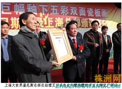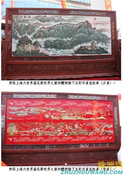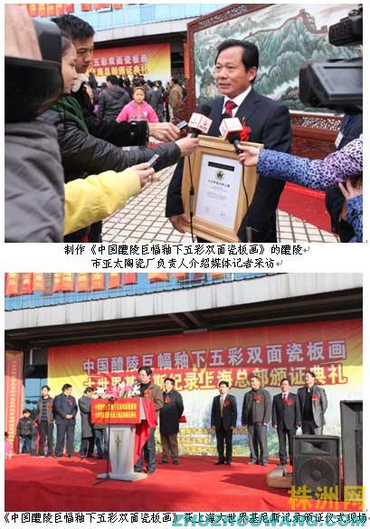 醴陵市亞太陶瓷廠于2010年11月成功制作了一塊當今世界上最大并獲基尼斯記錄的《中國醴陵巨幅釉下五彩雙面瓷板畫》。12月18日,在醴陵舉行了隆重頒證儀式,以宣傳醴陵釉下五彩瓷產(chǎn)業(yè),推介醴陵形象,推動旅游升溫。