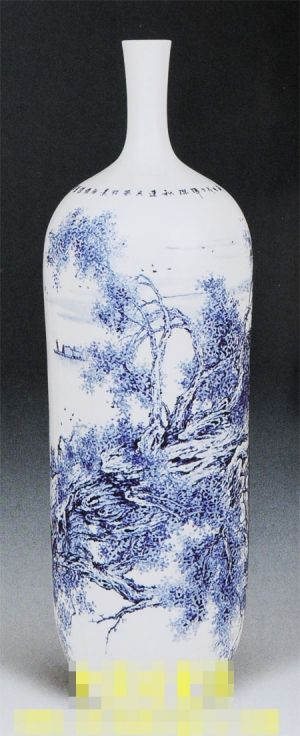 達民的瓷展上既有無數(shù)的青花作品,又有別具風(fēng)韻的粉彩和淺絳彩作品。觀者目不暇接。觀其粉彩作品無論是山水、花鳥都給人富貴雍容的視覺效果。粉彩是多種鈷色在陶瓷上的運用,古人畫粉彩多以工筆為主,近代尤以民國汪曉棠、潘匋宇為最。而達民既能追溯古人,又能突破傳統(tǒng),不拘泥于傳統(tǒng)。把用于淺絳寫意的手法結(jié)合于粉彩制作,創(chuàng)作出兼工帶寫的藝術(shù)效果,典型的作品如《家在江南黃葉村》、《過分水嶺》、《榕陰圖》等。淺絳山水用色灑脫,如色釉瓷瓶《黃山煙云》、《群峰疊嶂》等栩栩如生、色調(diào)淋漓。他把粉彩色層厚和淺絳彩色層薄的藝術(shù)在陶瓷上呈現(xiàn)得淋漓盡致。達民的青花作品更是他的強項。他研究燒制青花多年,為此付出不少心血。青花瓷雖然是單色瓷或少數(shù)彩,但創(chuàng)造出詩化般的意境歷來是陶藝家為之奮斗的目標。青花瓷的魅力是在單色中又墨分五色,盡顯濃淡枯濕。裝飾性和夸張性是無與倫比的。歷來青花藝術(shù)家更注重的是它的寫意性。以灑脫、自由、出神的形象結(jié)合詩與畫的完美統(tǒng)一,從而創(chuàng)造出詩化般的意境。青花瓷的制作過程也較為冗繁:起稿-過稿-勾線-施釉-燒成,難度較大。往往陶瓷藝術(shù)家借青花瓷來抒發(fā)自己的情感,表達作者的追求,讓眾人在聯(lián)想中產(chǎn)生共鳴,這就是青花藝術(shù)的真諦。達民正是因為諳熟了這些真諦,才傾注了滿腔熱情,用筆唱出了他自己心中的“歌”。他繪的青花山水,曼妙秀逸、渾厚華滋。筆法既有傳統(tǒng)又具創(chuàng)新,畫面更是陳兵布將,慘淡經(jīng)營。他的作品大度雍容、水分充足、雅倩養(yǎng)眼、出神入化?傊_民對青花瓷已把握得十分地道。他使繪畫和陶瓷藝術(shù)有機地融合,就如藍天包容著白云一樣,那么協(xié)調(diào)、清澈。