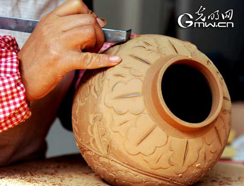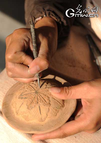 圖為龍泉青瓷工匠在為晾干的青瓷進(jìn)行刻花。記者 楊慧峰攝
