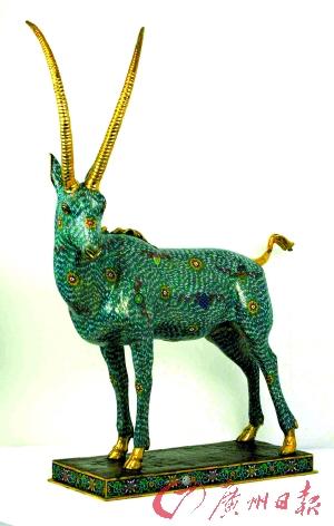 清代銅胎掐絲琺瑯寶絲花紋公羊:羊首神氣活現(xiàn)、身軀肌理豐腴,兩角尖銳仰上,并刻上螺絲狀紋。羊首、羊身、四足為翠藍(lán)色,順著動(dòng)物身上繪有披毛及花紋,細(xì)膩動(dòng)人。雙角、背上披毛、尾巴皆鍍金,腳踏金蹄,公羊線條優(yōu)美,姿勢(shì)優(yōu)雅矯健,形神兼?zhèn),為難得一見(jiàn)的獸型掐絲琺瑯稀世奇珍,估值達(dá)二百多萬(wàn)港元。