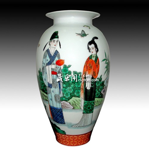 古彩,以五色競妍、富麗堂皇、線條剛勁、形象概括、構(gòu)圖圓滿,具有濃郁的中國民族藝術(shù)特征而著稱于世。在現(xiàn)當(dāng)代從事古彩創(chuàng)作的藝術(shù)家中,中國工藝美術(shù)大師戴榮華老師是當(dāng)代古彩真正傳人,古彩這一藝術(shù)奇葩在他手中推到了登峰造極的水平,是名副其實(shí)的“當(dāng)代官窯”。此次展覽活動有兩件古彩精品首次亮相藏樂閣,一件是2007年曾經(jīng)拍賣過的《紅葉傳情》,一件是2010年戴榮華老師創(chuàng)作的精品《人面桃花相映紅》。兩件作品人物神態(tài)各有特點(diǎn),讓人不由得想起“三千粉黛無顏色“這個經(jīng)典絕句。
