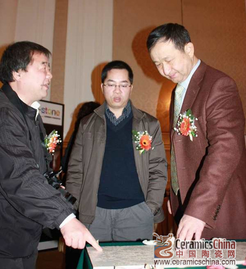 (中國(guó)建筑衛(wèi)生陶瓷協(xié)會(huì)會(huì)長(zhǎng)葉向陽(yáng)(右)在廣東金牌陶瓷有限公司生產(chǎn)總經(jīng)理梁志啟(中)的陪同下鑒賞新品.)